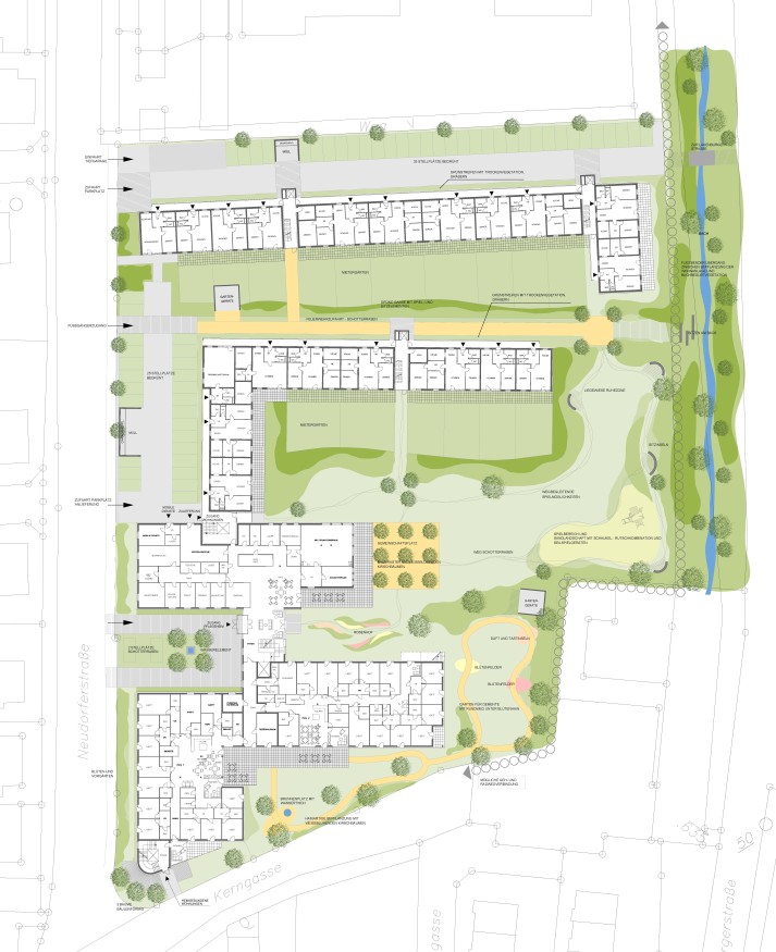 Für das Seniorenhaus Guntramsdorf wurde ein an den speziellen Bedürfnissen pflegebedürftiger BewohnerInnen orientiertes Freiraumkonzept entwickelt. Jede Wohnung sollte dabei über eine Anbindung an den Freiraum – durch Gartenanteile, Balkone oder Terrassen – verfügen.